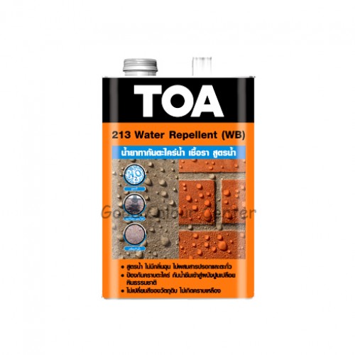 TOA 213 รุ่น WATER REPELLENT สูตรน้ำ สำหรับป้องกันคราบเชื้อรา ตะไคร่น้ำ และยังสามารถป้องกันน้ำซึมเข้าสู่ผนังได้เป็นอย่างดี ผิวงานทนทานมากขึ้น โดยไม่มีส่วนผสมของน้ำมัน ไม่มีกลิ่นฉุน