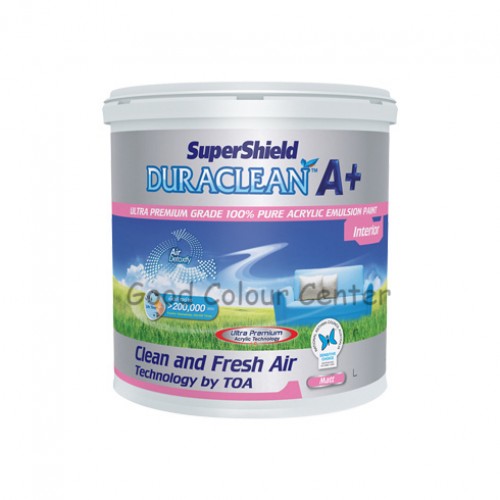 TOA SuperShield DURACLEAN A+ ซุปเปอร์ชิลด์ ดูราคลีน เอ พลัส สีน้ำอะคริลิคแท้ 100% ชนิดด้าน เป็นสีทาบ้าน สำหรับทาผนังภายใน ที่สุดแห่งนวัตกรรมสีเพื่อสุขภาพ สีสะอาด ไร้กลิ่น สร้างอากาศบริสุทธิ์ ใช้วัตถุดิบจากธรรมชาติ ปลอดภัยสูงสุดต่อผู้อยู่อาศัย เป็นสีทาภายในที่โรงพยาบาลเลือกใช้ เหมาะสำหรับห้องนอน โรงเรียน พื้นที่สำหรับเด็กเล็ก พื้นที่ที่ต้องการใช้งานทันที เช่น โรงแรม ระเบียง
