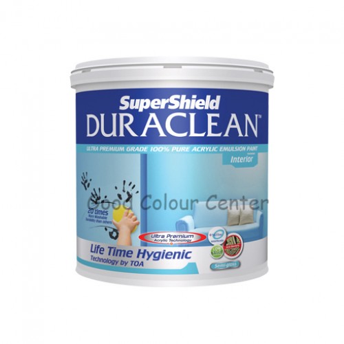 TOA SuperShield DURACLEAN ซุปเปอร์ชิลด์ ดูราคลีน สีน้ำอะคริลิคแท้ 100% ชนิดกึ่งเงา เป็นสีทาบ้าน สำหรับทาผนังภายใน ทนต่อการขัดถูมากกว่าสีทั่วไป 20 เท่า ป้องกันแบคทีเรียและเชื้อรา เหมาะสำหรับโรงพยาบาล ห้องนอน โรงเรียน พื้นที่สำหรับเด็กเล็ก โรงแรม ห้องโถง ร้านอาหาร