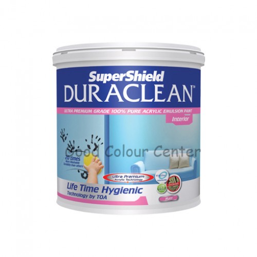 TOA SuperShield DURACLEAN ซุปเปอร์ชิลด์ ดูราคลีน สีน้ำอะคริลิคแท้ 100% ชนิดด้าน เป็นสีทาบ้าน สำหรับทาผนังภายใน ทนต่อการขัดถูมากกว่าสีทั่วไป 20 เท่า ป้องกันแบคทีเรียและเชื้อรา เหมาะสำหรับโรงพยาบาล ห้องนอน โรงเรียน พื้นที่สำหรับเด็กเล็ก โรงแรม ห้องโถง ร้านอาหาร